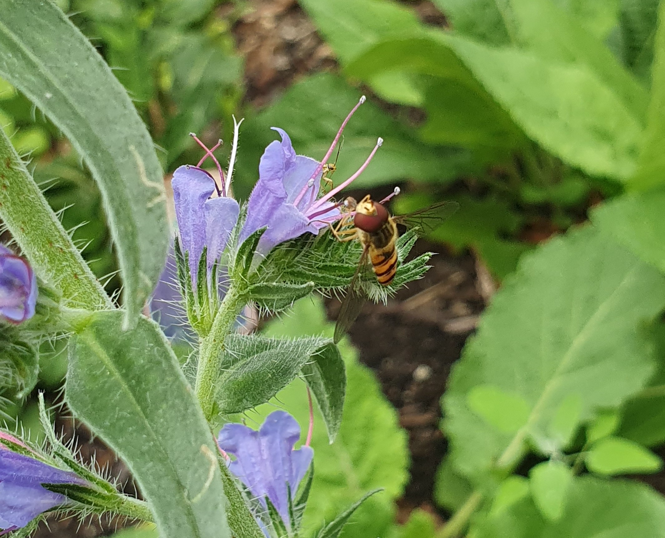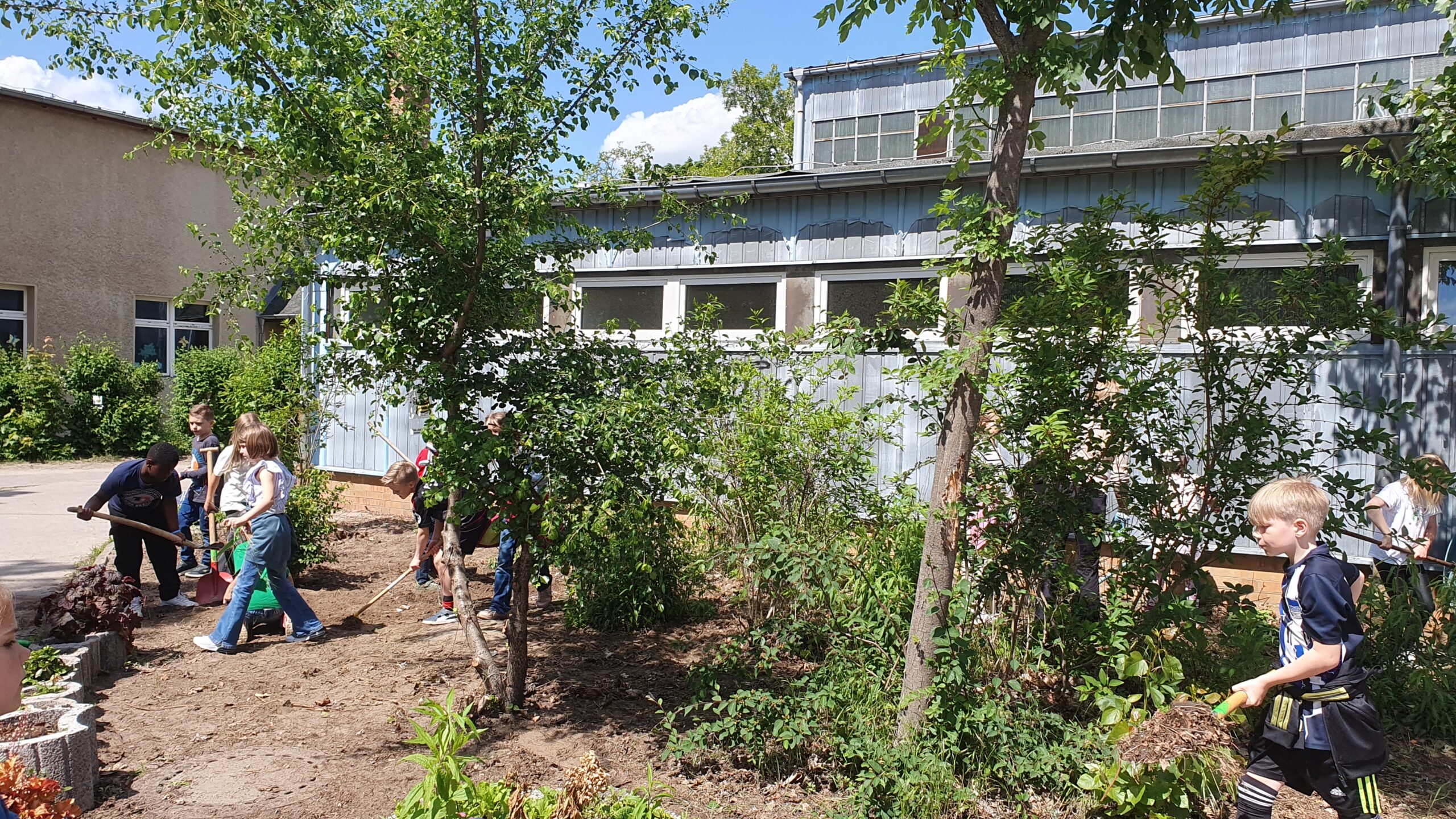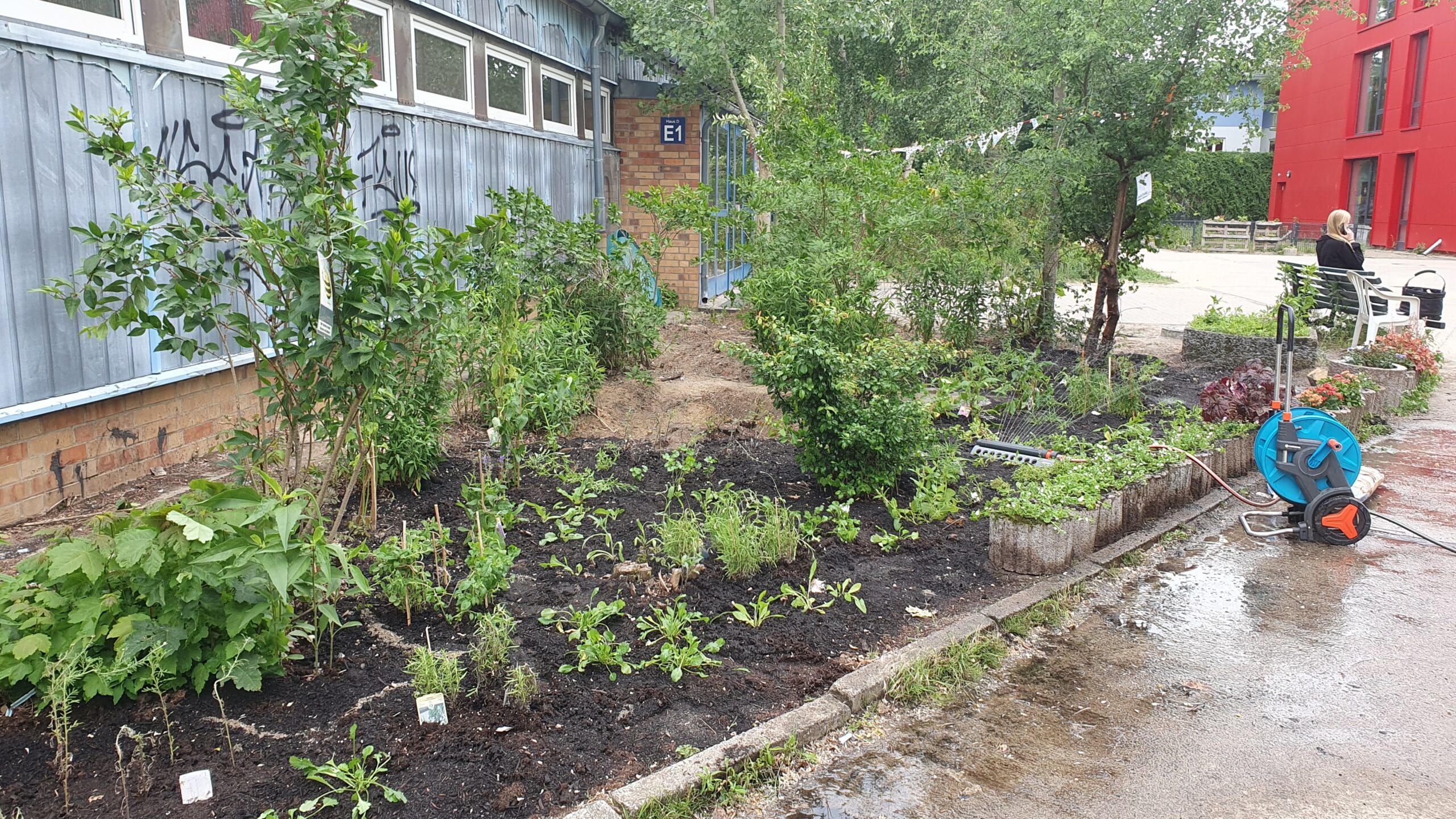 An verschiedenen Aktionstagen haben wir schon das erste Areal bearbeitet: Ungeeignete Pflanzen wurden entfernt, der Boden umgegraben, mit Komposterde aufgefüllt und dann mit insektenfreundlichen, heimischen Pflanzen bepflanzt. Die Pflanzen und die Erde wurden mit Hilfe von Grün macht Schule und durch Spenden von unserem 1. Hoftag finanziert. Viele begeisterte Helfer – Lehrer, Eltern und Schüler – haben aus einem „toten“ Stück Schulhof eine lebendige Oase geschaffen, die Insekten Nahrung, Schutz und Blütenvielfalt bietet.