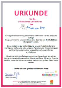 Großer Dank für die Weihnachtsspende Daniela Schneider2026-03-16T10:21:22+01:0016.03.2026| Ein großer Dank aus tiefstem Herzen erreichte uns von der Björn Schulz – Stiftung für unsere Weihnachtsspende. Es sind 1.736,85 € zusammengekommen. Toll! Mit Klick auf das Bild könnt ihr die Nachricht in Gänze lesen. 🙂