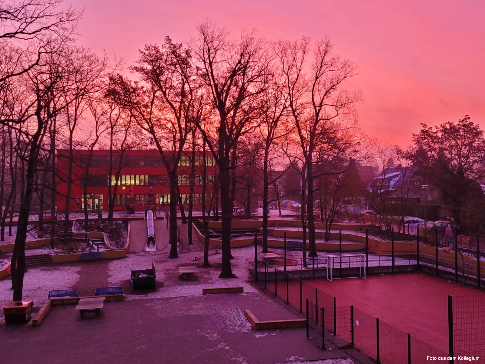 Bald ist Frühling, dann kann es losgehen! Bis dahin – schaut euch dieses stimmungsvolle Bild von unserem Winter-Schulhof an: