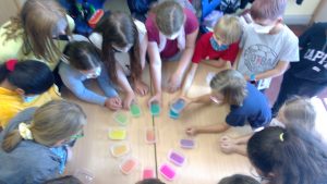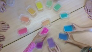 Mit Überraschen stellten alle fest, dass man zum Malen lediglich drei Farben benötigt und wie schön die entstehenden Farben doch sind.