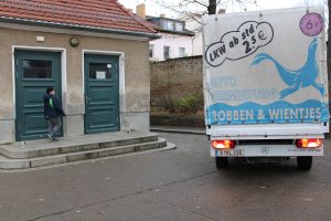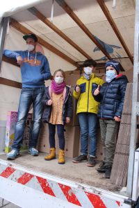 Zwei der tollen Helfer_innen durften sogar ein kleines Stück auf dem Schulhof mitfahren, als der LKW dann vollbeladen wieder losfuhr.