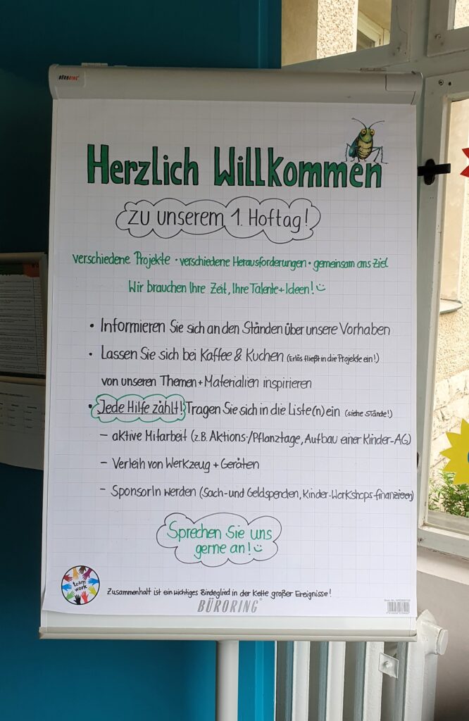 • Eltern aktivieren: Wir holten Ideen und Hände für Projekte wie insektenfreundliche Beete, Repair-Cafés oder Tauschbörsen.