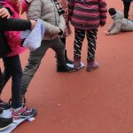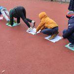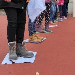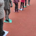 Nach der ersten Hofpause ging es „Übers Moor“. In zwei Gruppen geteilt, sollten die Schülerinnen und Schüler die andere Seite erreichen, ohne jemanden im Moor zu verlieren. Dabei mussten die Lappen als Trittflächen herhalten und immer mit mindestens einem Körperteil berührt werden – sonst verschwanden sie. Gar nicht so einfach! – Vor allem, zu verstehen, dass es nicht das Ziel war, als erster am anderen Ende anzukommen … In der anschließenden Reflexion war aber allen klar, was sie hätten machen müssen, was gut gelaufen war und was nicht so gut. Prima!