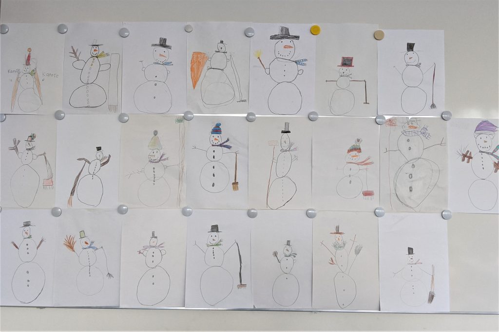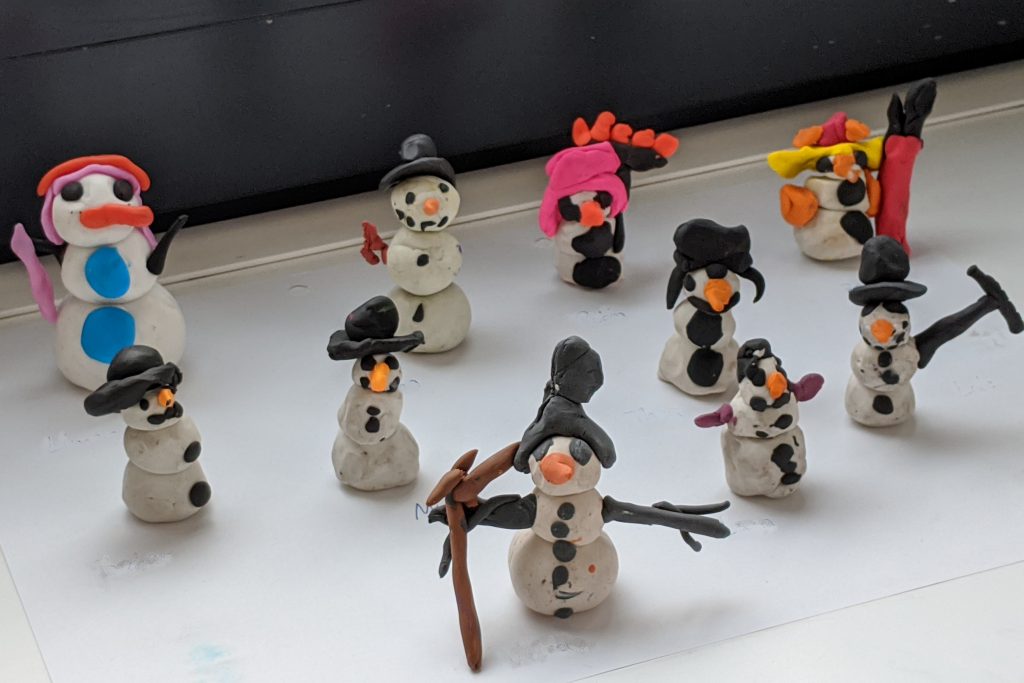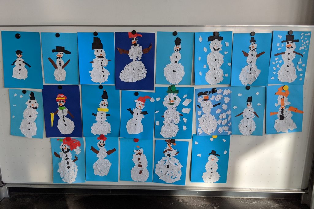 In diesem Winter gab es zwar leider keinen Schnee, aber wir haben trotzdem wunderschöne Schneemänner erschaffen: Wir haben geknetet, gezeichnet, geschnipselt und geklebt.